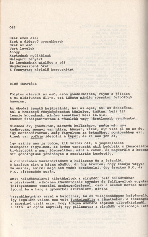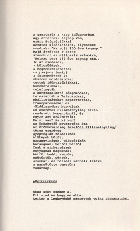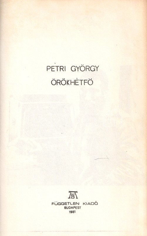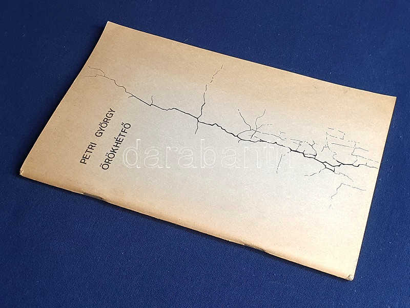 Petri György (1943-2000) első verseskötetei 1974-ben jelentek meg, a következő évtől a szerző publikálási tilalom alá került. Örökhétfő című kötete pályájának alapvető fontosságú munkája, a közép-európai közéleti és magánéleti válságjelenségek, úttévesztések és értelmiségi kilátástalanságok megformált verseskötete, az első szamizdat kiadású verseskötet. Először 1981-ben jelent meg illegálisan, szamizdatban, 940 példányban, szitanyomásban. Példányunk a mű három évvel későbbi, rendkívül ritka kiadása, mely a kolofon szerint Chicagóban készült. A szövegek előtt a költő kocsmapult előtt álló portréja.
