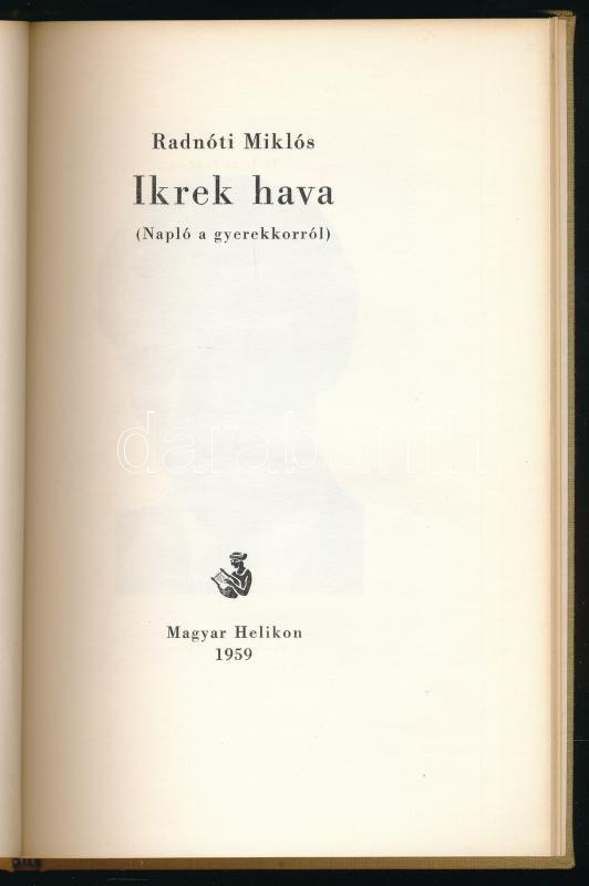 Radnóti: Ikrek hava (Napló a gyerekkorról). Számozott (368/1100) példány. 1959, Magyar Helikon. Kiadói egészvászon kötés, jó állapotban.