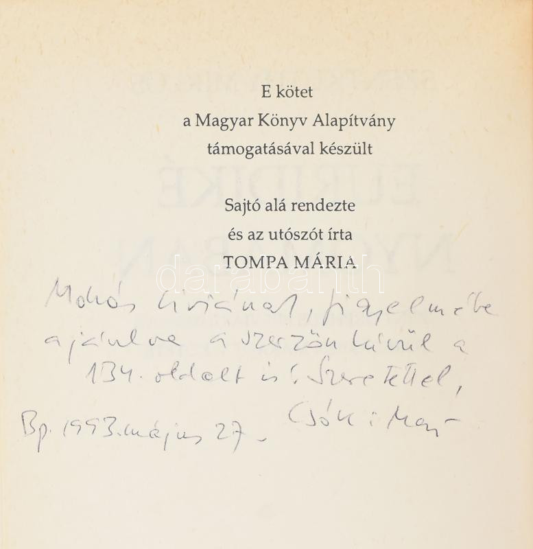 Szentkuthy Miklós: Euridiké nyomában. Szent Orpheus Breviáriumának töredékben maradt V. kötete. A szöveget gondozta, sajtó alá rendezte: Tompa Mária. A szerkesztő, a Szentkuthy-hagyaték kezelője, Tompa Mária (1936- ) által Mohás Lívia (1928-2024) pszichológus, József Attila-díjas írónak DEDIKÁLT példány, dátumozott példány. Bp.,1993., Magvető. Első kiadás. Kiadói papírkötés.