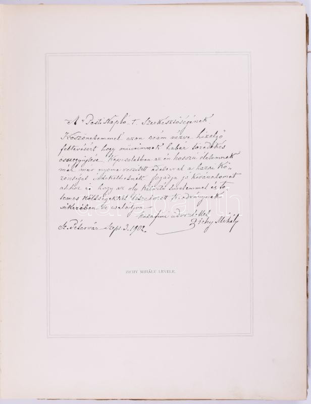 Zichy Mihály élete, művészete és alkotásai. Tizennyolc szövegképpel és negyven műmelléklettel. A Pesti Napló ajándéka. Bp., 1902, Athenaeum, 76p. + 40 t. Számos szövegközi és egészoldalas illusztrációval. Kiadói illusztrált, festett, szecessziós egészvászon-kötésben, kopott borítóval, kijáró lapokkal, és néhány lap szélén sérülésekkel.