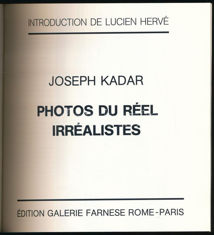 Joseph Kadar: Photos du Réel Irréalistes. Introduction de Lucien Hervé. Rome - Paris, 1985., Edition Galerie Farnese, 24 sztl. lev. Francia nyelven. Joseph Kadar fekete-fehér fotóival illusztrált. Kiadói papírkötés.