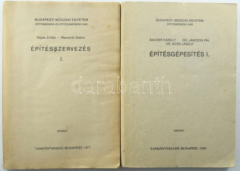 Vajda Zoltán - Neuwirth Gábor: Építésszervezés I. + Bacher Károly - Lánczos Pál - Soós László: Építésgépesítés I. BME Építőmérnöki Kar. Bp., 1977-1991, Tankönyvkiadó. Kiadói papírkötések, kopott, foltos borítóval, az első kötet erősen foltos lapokkal és a hátsó borítóján tollas jegyzettel.