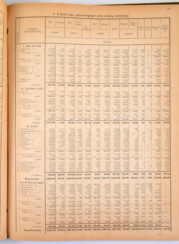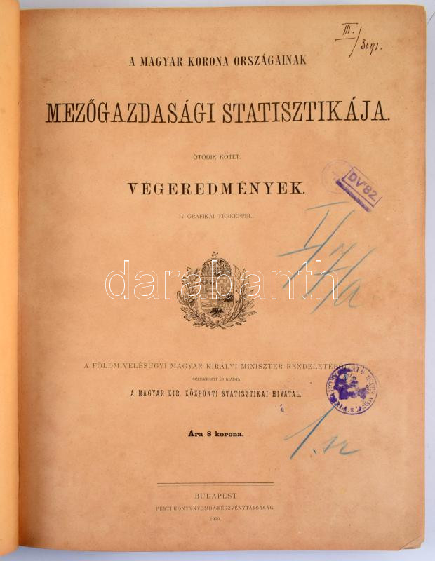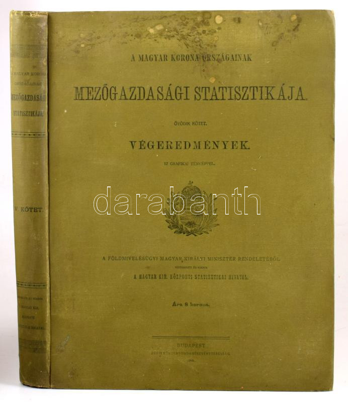 A magyar korona országainak mezőgazdasági statisztikája. V. kötet: Végeredmények. 17 grafikai térképpel. Bp., 1900, M. Kir. Központi Statisztikai Hivatal (Pesti Könyvnyomda Rt.), IV+(2)+89+234 p. + 17 t. (színes térképek, ebből 8 kétlapos). Kiadói egészvászon-kötés, kissé foltos borítóval, belül jó állapotban, intézményi bélyegzőkkel.