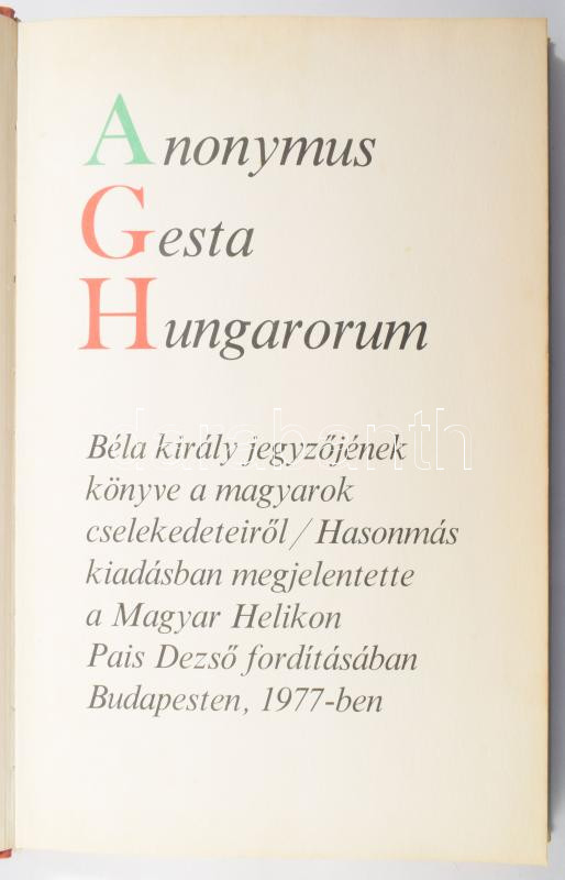 Anonymus: Gesta Hungarorum. Béla király jegyzőjének könyve a magyarok cselekedeteiről. Ford., és jegyzetekkel ellátta: Pais Dezső. A bevezetőt írta, a jegyzeteket kiegészítette és a térképet tervezte: Györffy György. Bp., 1977, Magyar Helikon. Hasonmás kiadás, fordítással. Kartonált papírkötésben, foltos, szakadt kiadói papír védőborítóval, jó állapotban.