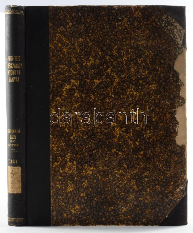 Az 1910. évi június hó 21-ére hirdetett országgyűlés képviselőházának irományai. XXXIX kötet. Hiteles kiadás. Bp., 1915, Pesti Könyvnyomda Rt., VII+(1)+444 p. Félvászon-kötésben, kissé sérült borítóval, helyenként lapszéli szakadásokkal, ázásnyomokkal.