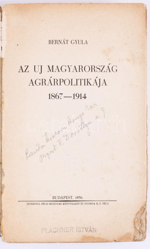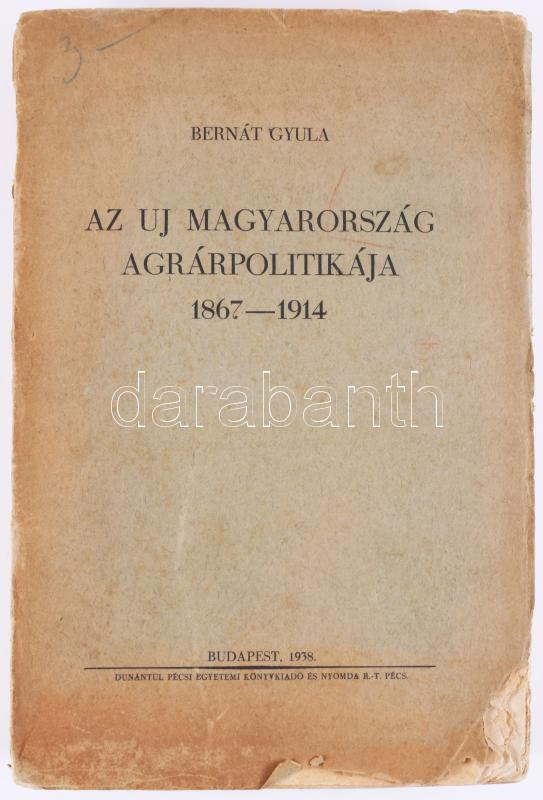 Bernát Gyula: Az új Magyarország agrárpolitikája 1867-1914. Bp., 1938, Dunántúl Pécsi Egyetemi Ny. 416p. Fűzve, kiadói, kissé töredezett szélű papÃrborÃtóban. Néháyn lap sarkán hiánnyal