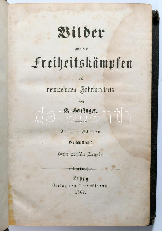 Bilder aus den Freiheitskämpfen des neunzehnten Jahrhunderts von Hausinger. Leipzig, 1867, Verlag von Otto Wigand. Félbőr kötés, gerinc sérült, kopottas állapotban.