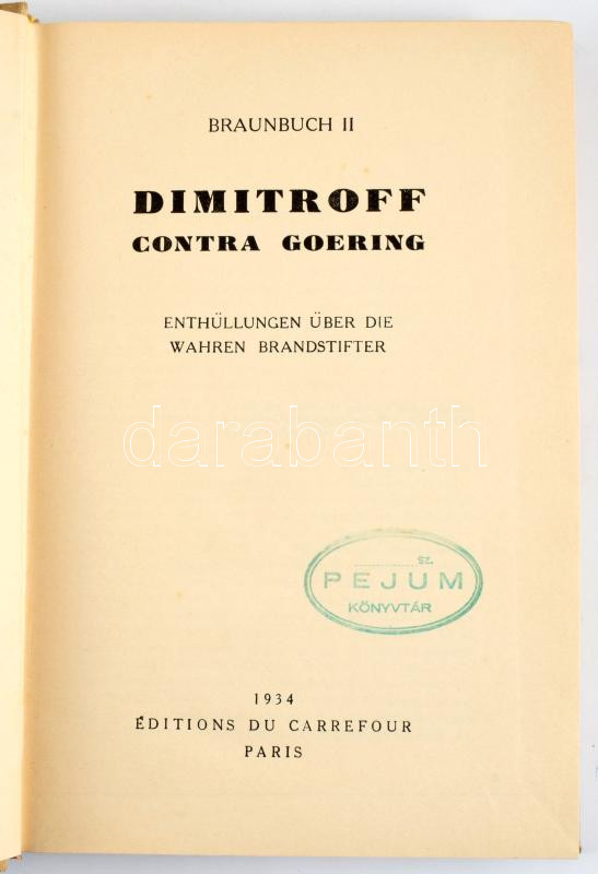Braunbuch II: Dimitroff contra Goering. Enthüllungen über die Wahren Brandstifter. Paris, 1934, Carrefour, 462+2 p. Német nyelven. Kiadói egészvászon-kötés, kopott borítóval.