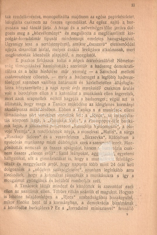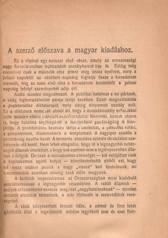 Ivan Nyikolajevics Buharin (1888-1938) orosz közgazdász, bolsevik forradalmár és politikus, elméletíró, Lenin és Sztálin legbelső köreinek tagja. Történeti áttekintése az oroszországi polgári forradalomtól (1917. február) a bolsevik hatalomátvételig (1917. október) terjedő időszakot értékeli sajátos nézőpontból, szenvedélyes hangon. A röpirat magyar fordításához írt előszavában Buharin összefoglalja a gyűlölendő ellenségek körét: ezek között pedig egyszerre szerepel a cári rendszer, a tőkés burzsoázia és legkivált a szociáldemokrácia, amely jobboldali elhajlásként, titkon áskálódva mindig is a tőkés rendszer kiszolgálójának szerepét játszotta; ennek megfelelően, Buharin elképzelése szerint, a szociáldemokratákkal, mint a munkásmozgalom árulóival különösképpen keményen kell elbánni. A Kun Bélának és Szamuely Tibornak küldött köszönetében a proletárdiktatúra gyorsabb magyarországi győzelmét sürgeti. Továbbá nem titkolja, hogy a szovjet kommunistáknak, mint a világforradalom zászlóvivőinek jogos igénye van arra, hogy a nyugati világ mind több államában kommunista hatalomátvétel történjen, ez ugyanis megosztja a szovjetrendszert ellenségesként kezeli nyugati tőkésállamok (imperialista hatalmak) erejét.