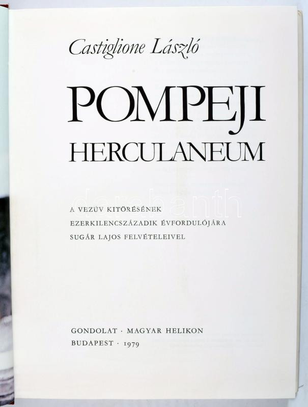 Castiglione László: Pompeji, Herculaneum. A Vezúv kitörésének ezerkilencszázadik évfordulójára. Sugár Lajos felvételeivel. Bp., 1979, Gondolat-Magyar Helikon, 282+6 p. Rendkívül gazdag képanyaggal illusztrált. Kiadói egészvászon-kötés, kiadói papír védőborítóban.