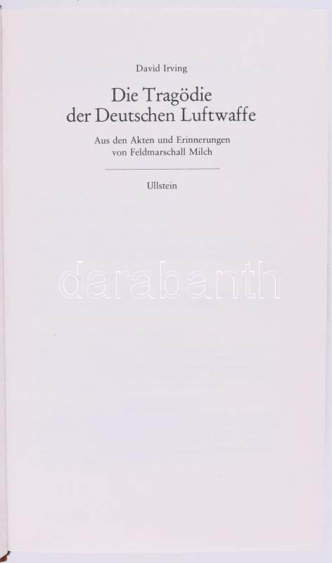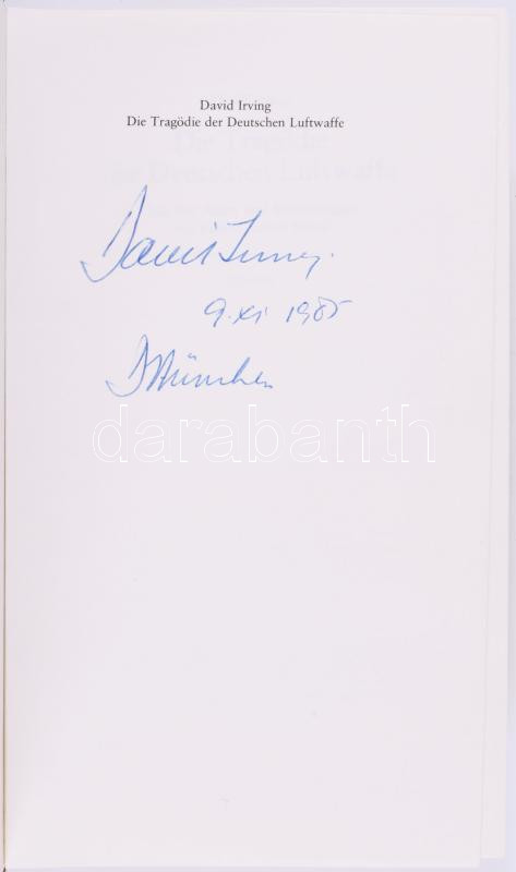 David Irving: Die Tragödie der Deutschen Luftwaffe. Aus den Akten und Erinnerungen von Feldmarschal Milch. A szerző, David Irving (1938-) író által ALÁÍRT példány. Frankfurt - Berlin, 1982, Ullstein. Német nyelven. Fekete-fehér illusztrációkkal. Kiadói egészvászon-kötés, kiadói papír védőborítóban.