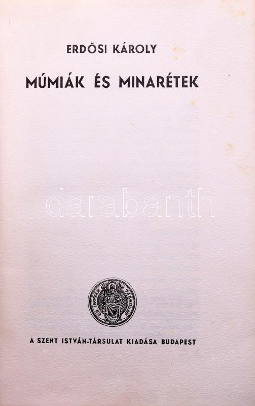 Erdősi Károly: Múmiák és minaretek. Bp., Szent István Társulat. Kiadói egészvászon kötés, foltos lapok, kopottas állapotban.