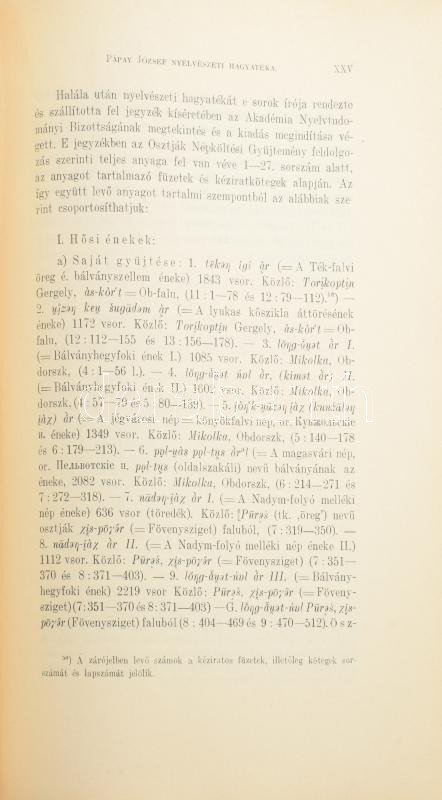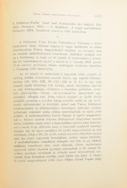 Északi-osztják medveénekek. Adalékok az obi-ugor népek medvekultuszához. Saját gyűjtése és Reguly Antal hagyományai alapján feldolgozta Pápay József. Pápay József nyelvészeti hagyatékából sajtó alá rendezte Fazekas Jenő. Budapest, 1934. Királyi Magyar Egyetemi Nyomda. LII + 142 p. A nyelvrokonaink medvekultuszáról írt néprajzi-nyelvészeti tanulmány és a magyar fordítással kísért osztják medveénekek közlése előtt Pápay József (1873-1931) finnugrista, néprajzkutató nyelvészeti munkásságának bibliográfiája. (A Debreceni Tisza István Tudományos Társaság I. Osztályának kiadványai. V. kötet, 9. füzet.) Fűzve, feliratozott kiadói borítóban