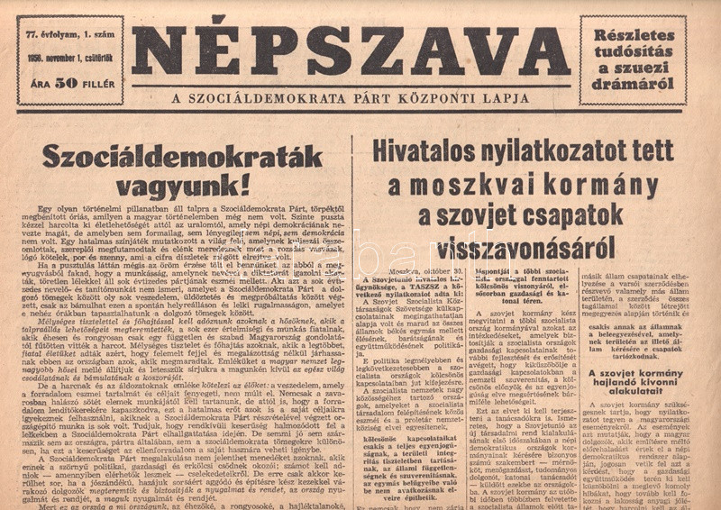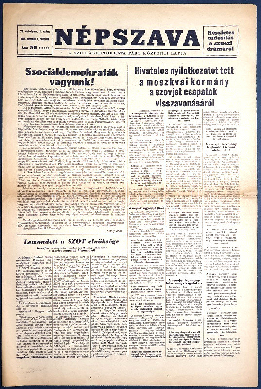 A nagy múltra visszatekintő baloldali lap, a szakszervezeti munkásság lapja a forradalom első napjaitól kezdve Nagy Imre kormányát támogatta, november 1-jétől pedig az újjáalakult Szociáldemokrata Párt lapjaként jelent meg. Lapszámunk vezércikkét a korábban félreállított és bebörtönzött Kéthly Anna volt országgyűlési képviselő, a magyar szociáldemokrácia vezető alakja írta.