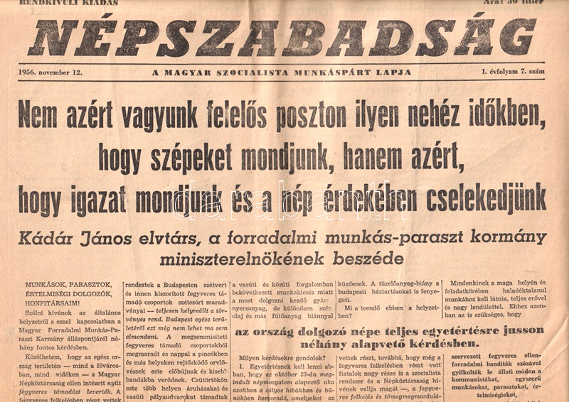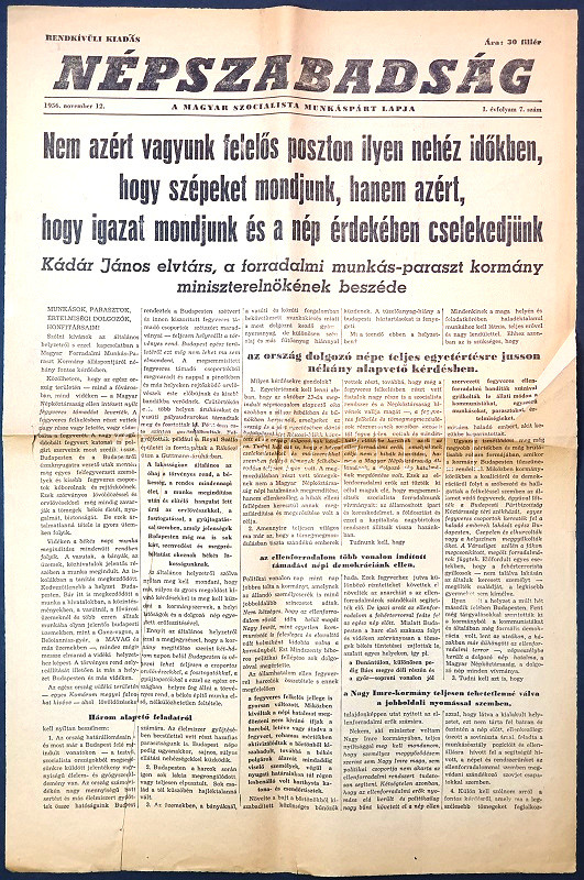 [Folyóirat, 1956.] "Nem azért vagyunk felelős poszton, hogy szépeket mondjunk, hanem azért, hogy a nép érdekében cselekedjünk. Kádár János, a forradalmi munkás-paraszt kormány miniszterelnökének beszéde". A Népszabadság rendkívüli kiadása. I. évfolyam, 7. szám. (1956. november 12.)