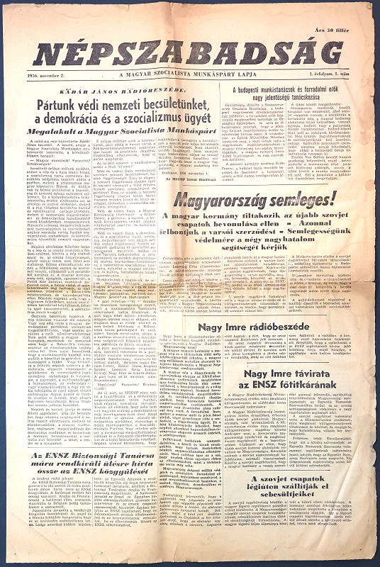 [Folyóirat, 1956.] "Pártunk védi nemzeti becsületünket, a demokrácia és a szocializmus ügyét". A többpártrendszer bevezetésének hírére nevet váltott párt, az MSZMP néven újjáalakult kommunista párt újdonsült sajtóorgánumának, a Népszabadságnak első lapszáma. I. évfolyam, 1. szám. (1956. november 2.)