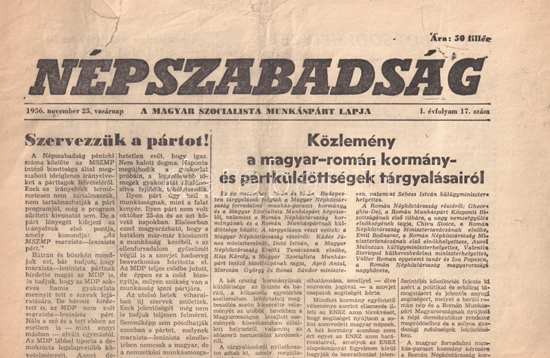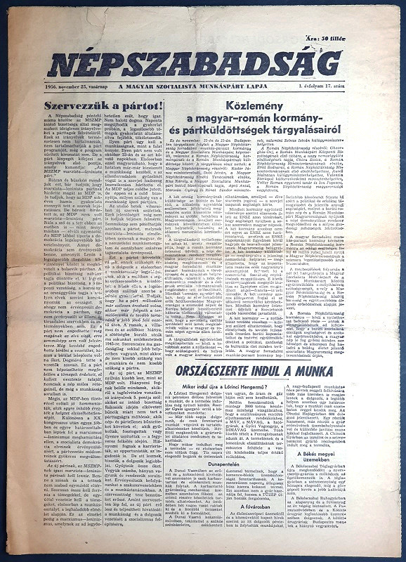 [Folyóirat, 1956.] Szervezzük a pártot! Országszerte indul a munka. Mindszenty bíboros jelentkezése az ellenforradalmi kísérletben. A Pravda cikke a magyarországi eseményekről. A Népszabadság lapszáma a megtorlás napjaiban. I. évfolyam, 17. szám. (1956. november 25.)