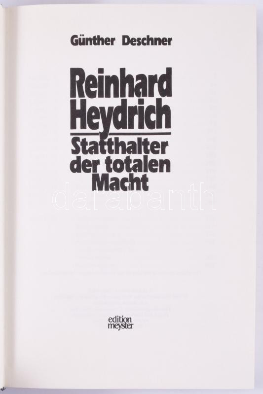 Günther Deschner: Reinhard Heydrich. Statthalter der totalen Macht. München, 1986, Meyster. Német nyelven. Fekete-fehér illusztrációkkal. Kiadói egészvászon-kötés, kiadói papÃr védÅ‘borÃtóban.