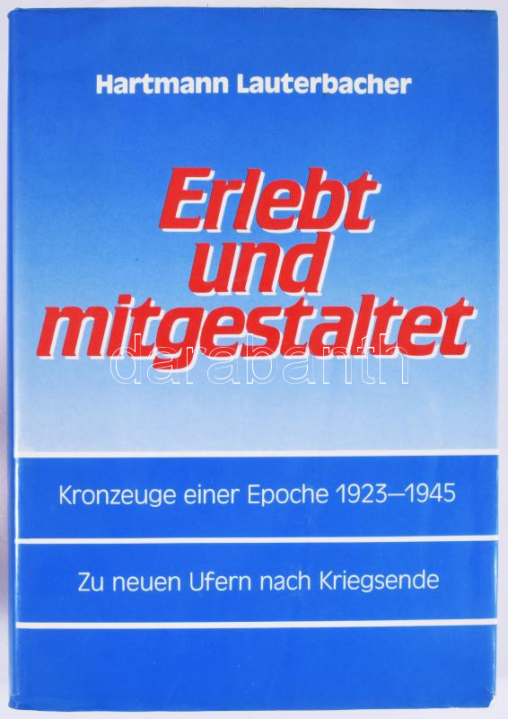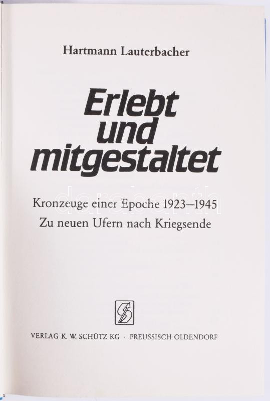 Hartmann Lauterbacher: Erlebt und mitgestaltet. Kronzeuge einer Epoche 1923-1945. Zu neuen Ufern nach Kriegsende. Preussisch Oldendorf,1984,K. W. Schütz KG. Német nyelven. Fekete-fehér fotókkal illusztrált. Kiadói egészvászon-kötés, kissé szakadt kiadói papír védőborítóban