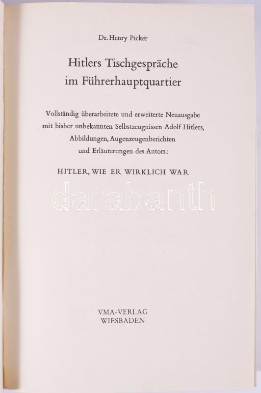 Henry Picker: Hitlers Tischgespräche im Führerhauptquartier. [Hitler asztali beszélgetése a Führer főhadiszállásán.] Wiesbaden,1983.,VMA-Verlag. Német nyelven. Fekete-fehér képanyaggal illusztrált. Kiadói papírkötés.