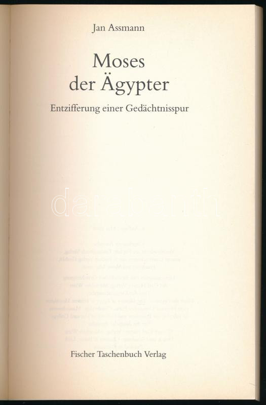 Jan Assmann: Moses der Ägypter. Entzifferung einer Gedächtnisspur. [Mózes, az egyiptomi.] Frankfurt am Main, 2007.,Fischer. Német nyelven. Kiadói papírkötés.