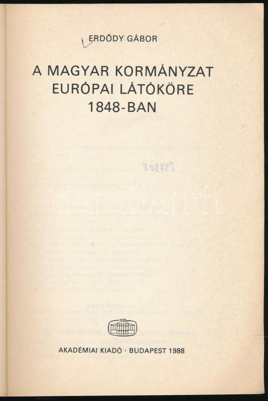 Kiss József: A magyar kormányzat európai látóköre 1848-ban. Értekezések a történeti tudományok köréből 108. Bp., 1988, Akadémiai Kiadó. Kiadói papírkötés, kopott borítóval, a borítón foltokkal, volt könyvtári példány.