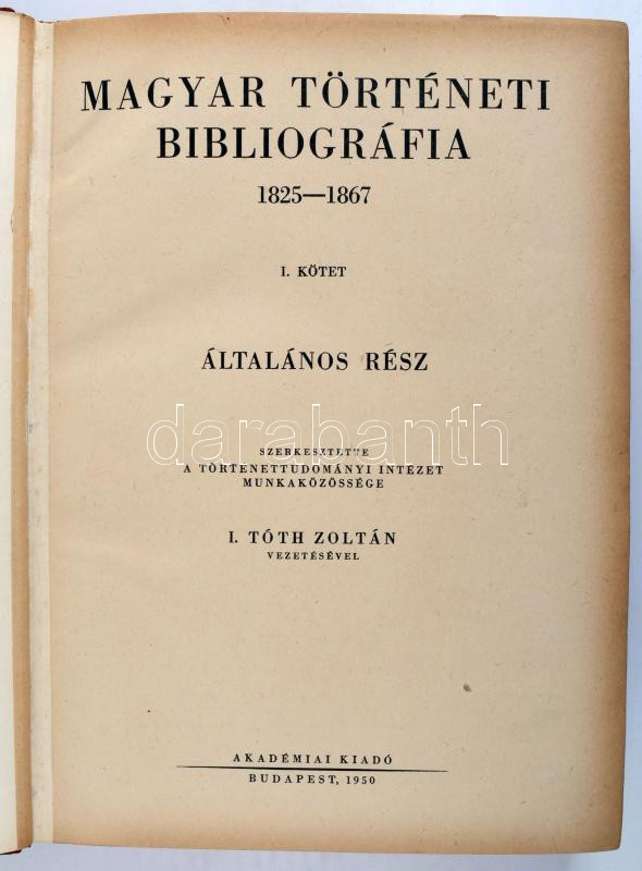 Magyar történeti bibliográfia 1825-1867. I?III. kötet. Szerk. Tóth Zoltán vezetésével a Történettudományi Intézet munkaközössége. (I.: Általános rész.. II.: Gazdaság. III.: Politika, Jog, Oktatás?Iskolák, Tudomány, Művészet, Sajtó, Vallás?Egyházak.)Bp., 1950?1959, Akadémiai Kiadó. 118,[1]; 260; 407; p. Egy kötetbe kötve, javított gerincű kartonált papírkötésben