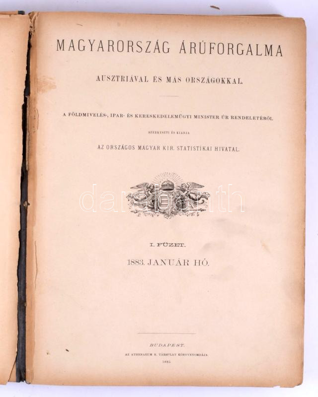 Magyarország árúforgalma Ausztriával és más országokkal. A földmivelés-, ipar- és kereskedelemügyi minister úr rendeletéből szerk. és kiadja az Országos Magyar Kir. Statistikai Hivatal. I-XII. füzetek. 1883. január-december. [Egybekötve.] Bp., 1883, Athenaeum. Félvászon-kötésben, viseltes állapotban, sérült gerinccel, helyenként sérült, kijáró lapokkal.