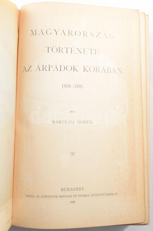 Marczali Henrik: Magyarország története az Árpádok korában. (1038-1301). A Magyar Nemzet Története II. kötet. Szerk.: Szilágyi Sándor. Bp., 1896, Athenaeum Irodalmi és Nyomdai Rt. Kiadói aranyozott egészvászon-kötés, enyhén sérült gerinccel,