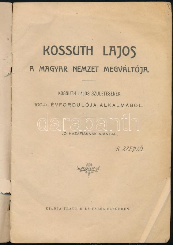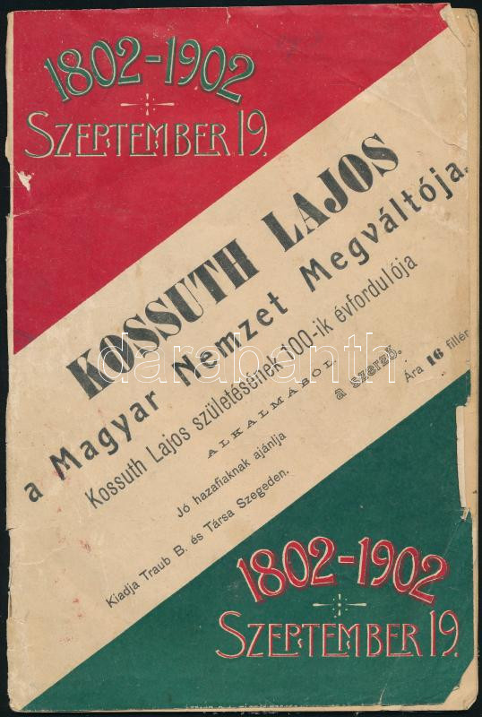 Sz.n.: Kossuth Lajos a Magyar Nemzet Megváltóa születésének 100. évfordulójára. Szeged. 1902. Traub B. 29 p + 1 t. Illusztrált kiadói papírborítóval, ceruzás firkával, sérült. Ritka.
