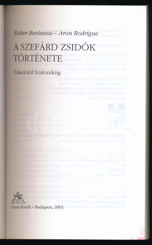 Esther Benbassa - Aron Rodrigue: A szefárd zsidók története. Toledótól Szalonikiig. Ford.: Ádám Péter. Csatai Erika, Szőts Dávid. Bp., 2003, Osiris. Kiadói papírkötés, néhány lap alsó sarkán kis foltokkal.