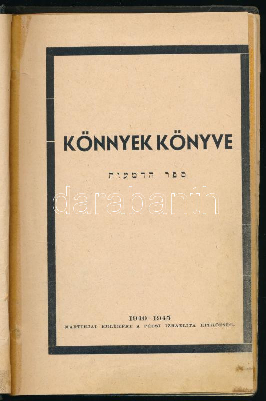 Könnyek könyve. 1940-1945 mártírjai emlékére a Pécsi Izraelita Hitközség. Pécs, é.n., Novák-ny., 79+[1] p. Kiadói zsinórfűzéses egészvászon-kötés, kopott borítóval, néhány lap széle ragasztott.