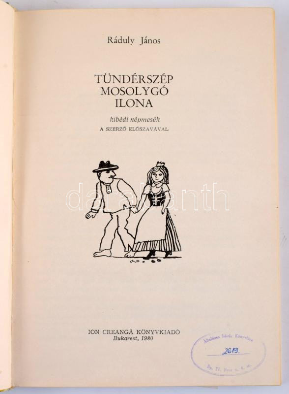 Ráduly János: Tündérszép mosolygó Ilona. Kibédi népmesék. Bukarest, 1980 Ion Creanga. Cseh Gusztáv illusztrációival. Kiadói illusztrált kartonált papírkötés, kopott, kissé foltos borítóval, régi intézményi bélyegzéssel.