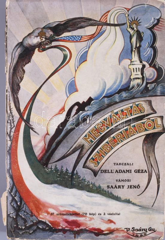 Dell' Adami Géza, tarczali: Megváltás Szibériából. Kidolgozta: Vámosi Saáry Jenő. A borító Vámosi Saáry Jenő munkája. Bp., 1925., Stephaneum-ny., 1 t.+ 264 p. + 36 (fekete-fehér képtáblák. t. + 2 (térképek, közte az egyik kihajtható) t. Kiadói színes, illusztrált papírkötésben, kopott borítóval, sérült gerinccel, foltos lapokkal.