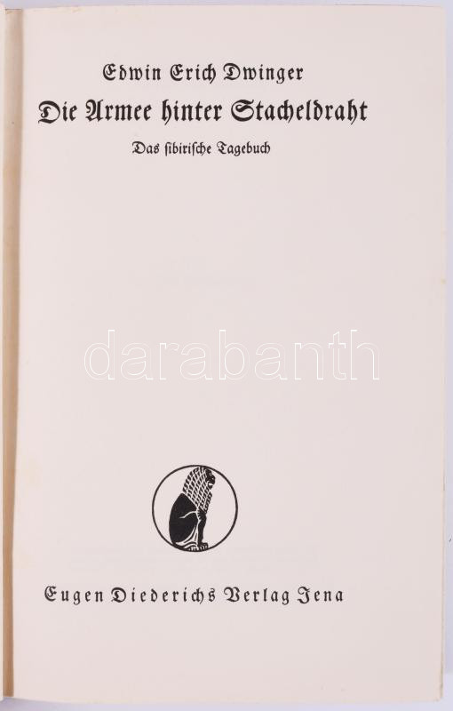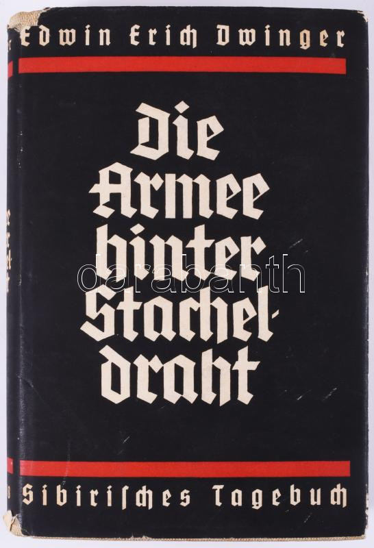 Edwin Erich Dwinger: Die Armee hinter Stacheldraht: Das Sibirische Tagebuch. Jena,[1929.],Eugen Diedrichs Verlag. Német nyelven. Kiadói egészvászon-kötés, szakadt kiadói papír védőborítóban, 1936-os német nyelvű ajándékozási sorokkal.