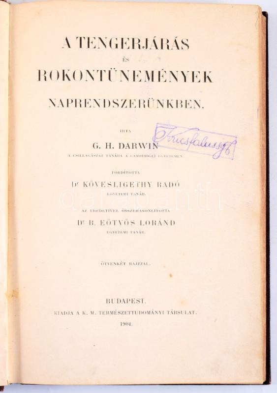 Darwin, G[eorge] H[oward]: A tengerjárás és rokontünemények naprendszerünkben. Fordította: Dr. Kövesligethy Radó. 52 rajzzal. Bp., 1904, K. M. Természettudományi Társulat, (Franklin-Társulat-ny.), XV+308 p. Kiadói aranyozott egészvászon kötés, márványozott lapélekkel, kopott borítóval.