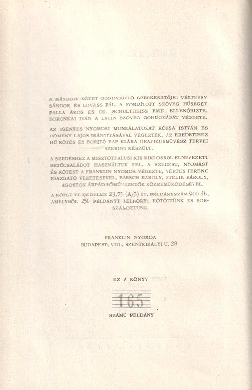 Összesen 900 példányban megjelent, számozott bibliofil kiadás. Kolofon: "Az igényes nyomdai munkálatokat Rózsa István és Deák Károly irányítása alatt végezték. Az eredetihez hű kötés és borító Pap Klára grafikusművész tervei szerint készült. A szedéshez a Misztótfalusi Kis Miklósról elnevezett betűcsaládot használtuk fel. Példányszám: 900 db, amelyből 250 példányt félbőrbe kötöttünk és sorszámoztunk. Ez a könyv a 165. számú példány".