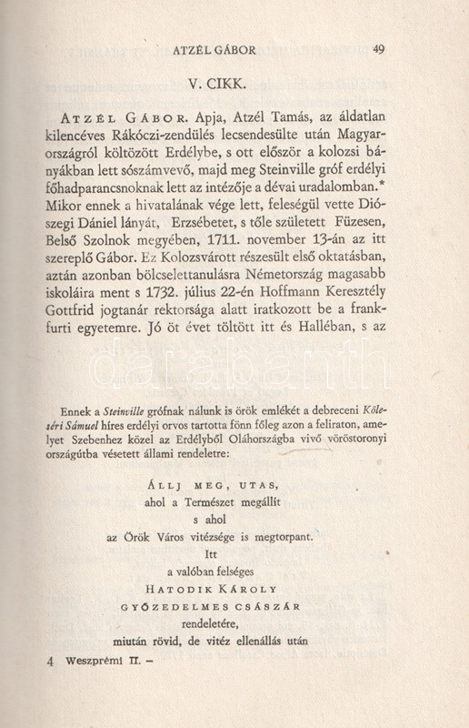 Weszprémi István (1723-1799) orvos, a hazai orvostörténet-írás megalapítója. Hatalmas könyvtárára támaszkodva írta meg fő művét, a "Succinta medicorum Hungariae et Transylvaniae biographia" című munkáját, mely a Magyarországon és Erdélyben működött orvosok életrajzát és könyvészetét adja közre. A mű négy kötetben jelent meg, 1774 és 1783 között, a magyar fordítás szintén négy kötetben, 1960 és 1970 között látott napvilágot.