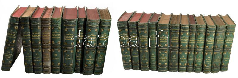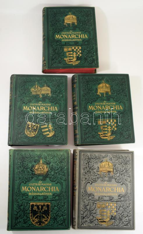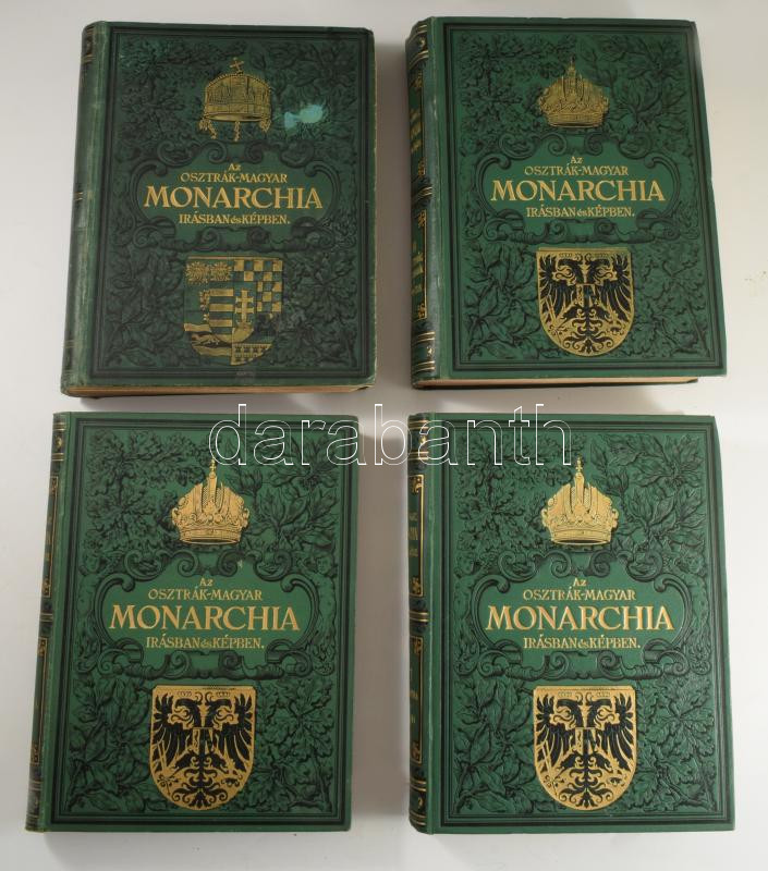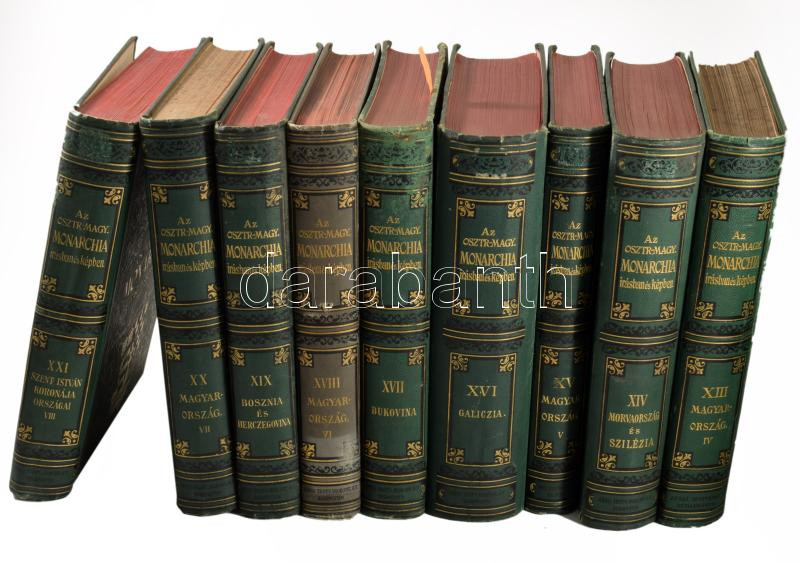 Az Osztrák-Magyar Monarchia írásban és képben I-XXI. kötet. Teljes. Egy kötet (XVIII.) szürke, a többi egységes zöld színű, Gottermayer Nándor-féle kötésben. Bp., 1887-1901, Magyar Királyi Államnyomda. Szövegközti és egész oldalas képekkel, térképekkel gazdagon illusztrált. Kiadói, aranyozott, dombornyomásos, egészvászon kötésben, változó állapotban, nagyrészt kissé kopott borítókkal, de közte kopottak is,de több jó állapotú is, néhány kötet borítója foltos, néhány gerincen kis sérüléssel, egyen pedig sérüléssel, egy kötet fűzése laza, egy kötet javított gerinccel, egy kötet javított kötéssel, egy kötetből (XVI.) egy tábla hiányzik a kettőből, részben bélyegzésekkel: köztük 3 kötetben intézményi bélyegzésekkel, foxing foltos lapokkal.