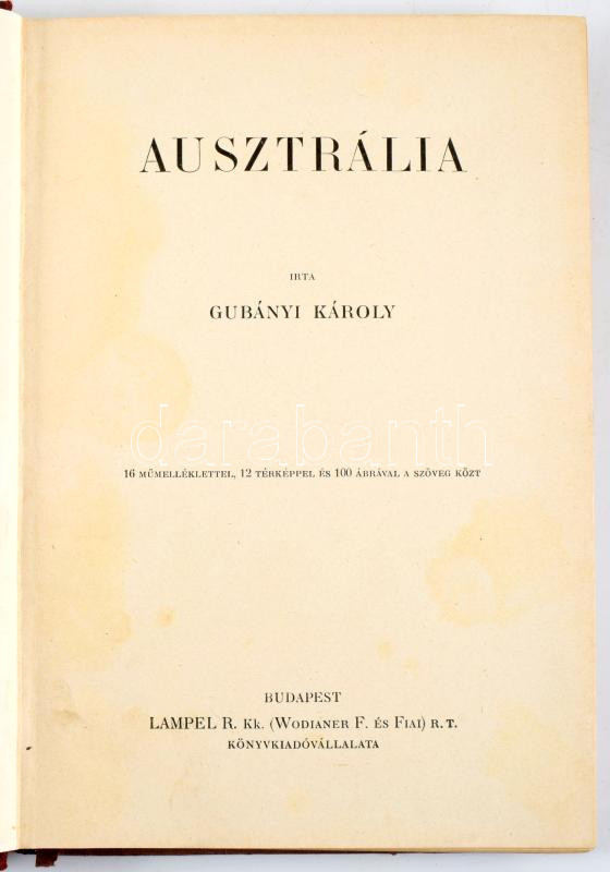 Gubányi Károly (1867-1935): Gubányi Károly: Ausztrália. Magyar Földrajzi Társaság Könyvtára. Bp., [1915], Lampel R., (Wodianer F. és Fiai) Rt., 1 t.+ 4+253+3 p.+15 (fekete-fehér fotók) t. Szövegközti fekete-fehér fotókkal és térképekkel. Kiadói aranyozott, illusztrált félvászon-kötés, márványozott lapélekkel, kis kopással.