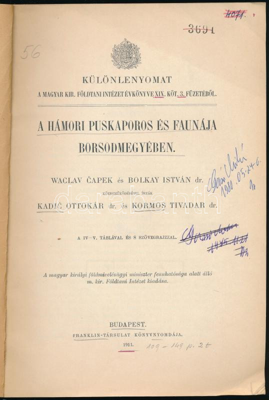 Kadic Ottokár - Kormos István: A hámori Puskaporos és faunája Borsod-megyében. Waclav Capek és Bolkay István dr. közreműködésével írták - - dr. és - - dr. Bp., 1911, Franklin, 2+109-149 p.+2 t. Kiadói papírkötés, volt könyvtári példány, a gerincen kis sérüléssel.