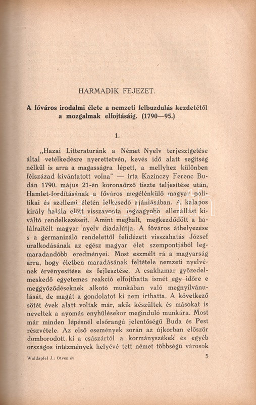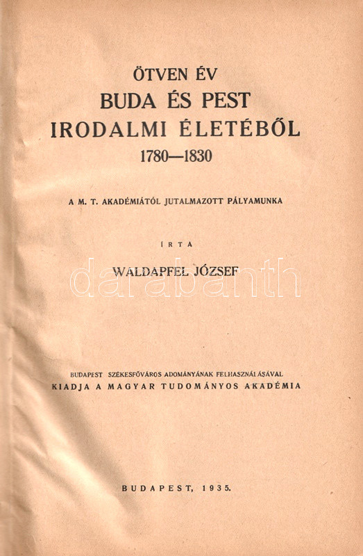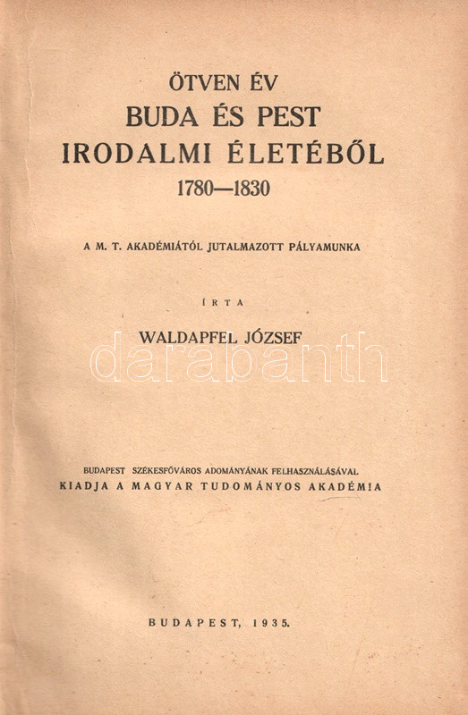 Waldapfel József: Ötven év Buda és Pest irodalmi életéből 1780-1830. A M. T. Akadémiától jutalmazott pályamunka.