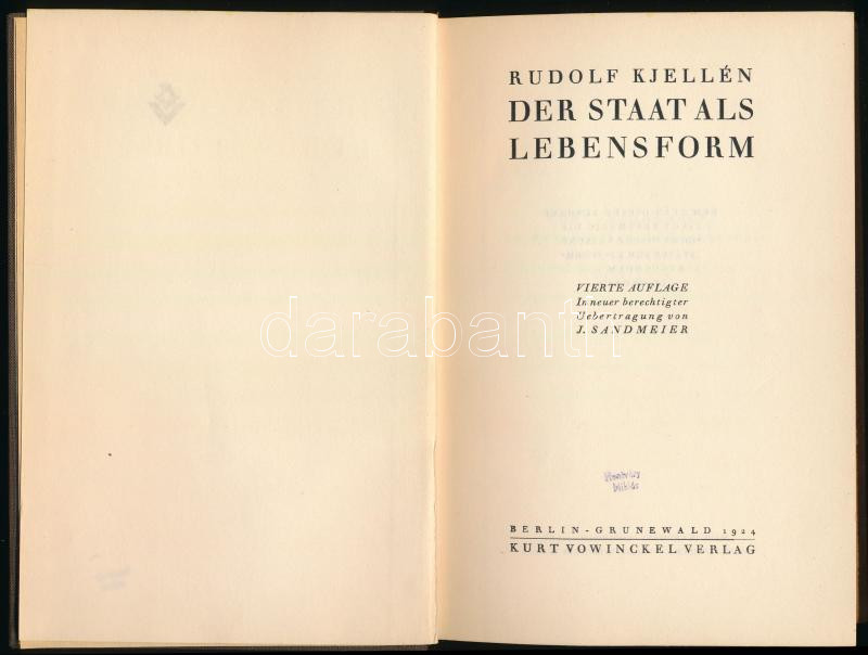 Kjellén, Rudolf: Der Staat als Lebensform. Berlin-Grunewald, 1924, Kur... https://www.darabanth.com/de/515-Auktion-Philatelie-Postkarten-Numismatik-Kunstwerke-Bucher-Schreibwaren-Schmuck/518.0/Bucher/Bucher-Sozialwissenschaften~1047/Kjellen-Rudolf-Der-Staat-als-Lebensform-Berlin-Grunewald-1924-Kurt-Vowinckel-4plus227plus1-p~II3487664