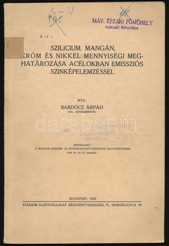 Bardócz Árpád: Szilicium, mangán, króm és nikkel mennyiségi meghatározása acélokban emissziós szinképelemzéssel. Bp., 1938, Stádium, 80 p.+ 3 (kihajtható) t. Kiadói papírkötés, intézményi bélyegzőkkel.