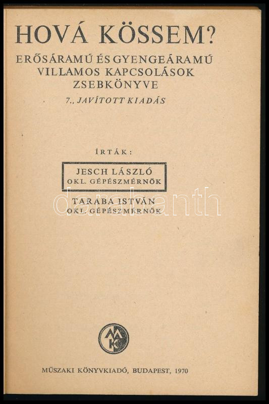 Jesch László - Taraba István: Hová kössem? Erősáramú és egyenáramú villamos kapcsolások zsebkönyve. Bp., 1970, Műszaki. Kiadói papírkötés, kissé kopottas állapotban.