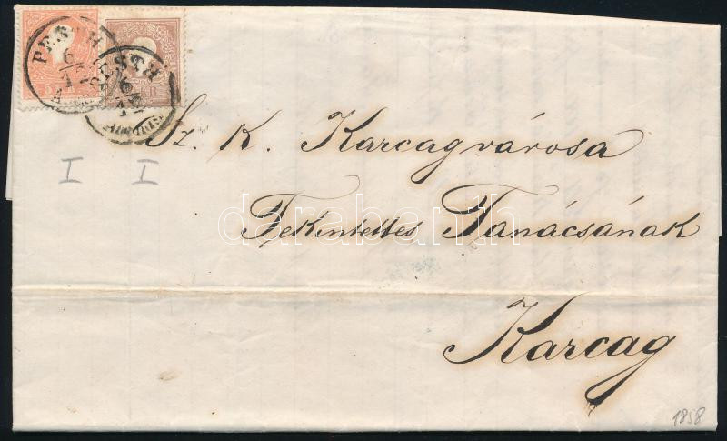 1858 5kr I. + 10kr I. levélen "PESTH / Abends" - Karcag