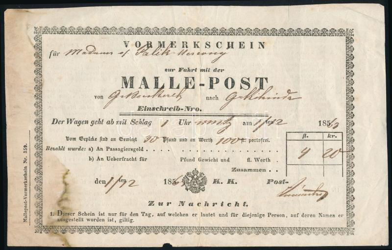1861 MALLE-POST utazási jegy G. Becskerek - G. Kikinda