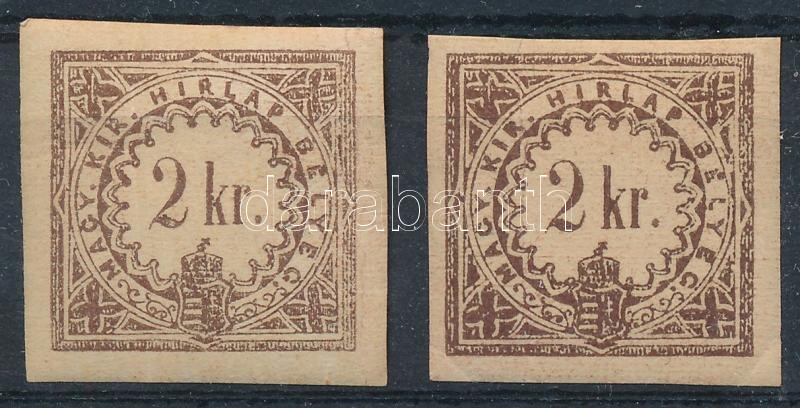 1868 2 db Hírlapilleték bélyeg 2kr eltérő színárnyalatban (ráncok, törések) / colour variety (creases, folds)
