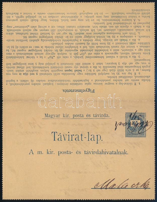 1889 Zárt táviratlap 3kr + 3 x 5kr bélyegekkel, "MALACZKA POZSO. M." bélyegzéssel, Rakbach (?) feladással