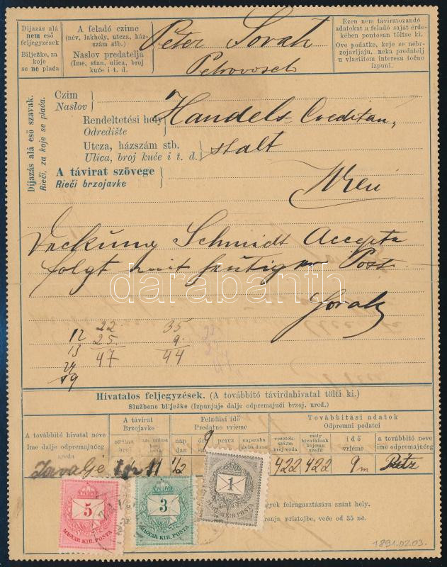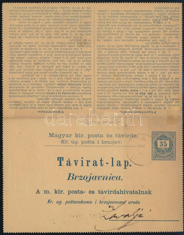 1891 35kr dÃjjegyes kétnyelvű táviratlap 1kr + 3kr + 5kr dÃjkiegészÃtéssel, Petrovoselóból Zavaljéba, majd továbbküldve Bécsbe. Eddigi ismereteink szerint az egyetlen létezÅ‘ 44kr-os bérmentesÃtés!